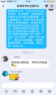 2020年2月27日下午,m88,m88.com,明升体育88四个学生支部(新闻系学生支部、影视系学生支部、新媒体系学生支部、研究生支部)全体党员通过线上语音连线、群消息沟通方式等开展了“战疫进行时,党员在行动”主题教育活动。本次党日活动主要围绕学习贯彻习近平总书记在统筹推进新冠肺炎疫情防控和经济社会发展工作部署会议上的重要讲话精神进行。
