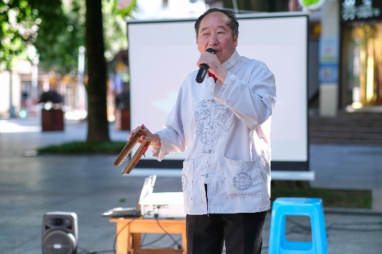 一声声竹板响配上极具节奏感的念白,文艺汇演在老年人协会代表周爷爷亲自创作的快板节目《永远不忘党的恩》中拉开帷幕。罗爷爷则用二胡和巴乌分别演奏了《山丹丹花开红艳艳》及《映山红》,紧接着实践队为现场的观众带来了相声表演和诗歌朗诵,铿锵有力的声音将汇演的气氛推入了高潮。一首《强军战歌》搭配整齐划一的动作表达了对祖国和党的热爱,唱出了当代大学生的责任感和担当精神,也赢得了台下观众的喝彩。