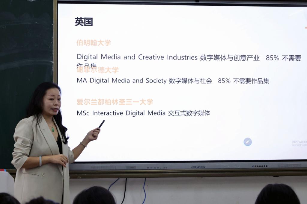 在讲解过程中,沈颖老师紧密结合各专业的职业发展轨迹,深入解读留学的价值与深远意义。她运用了大量实际案例和详实数据,使同学们对留学的认知更为直观、透彻。此外,沈颖女士积极与同学们展开互动,耐心解答各类留学相关疑问,现场气氛热烈非凡、融洽和谐。