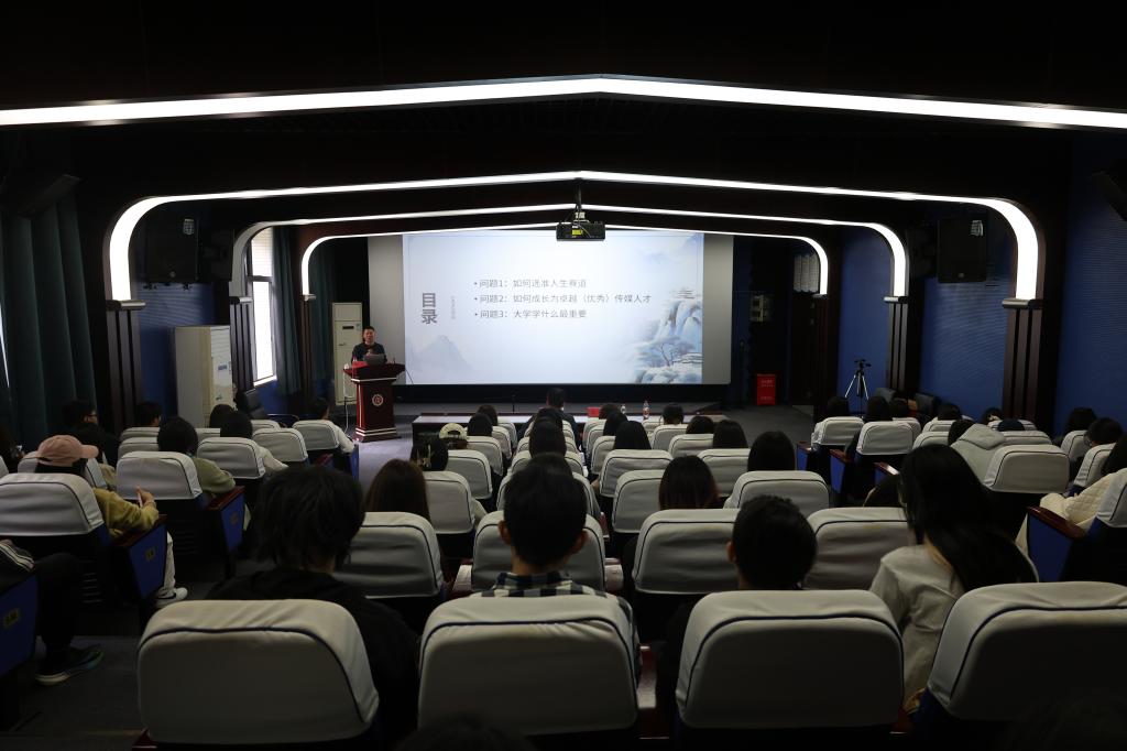 讲座伊始,邱飞教授结合自身在传媒领域的丰富经验,深入剖析了当前大学生在职业发展中所面临的困惑与挑战,引发了在场学生的广泛共鸣。他围绕“如何选准人生赛道”这一核心议题,以媒体人吴晓波的成长路径为例,指出人生不应自我设限,并强调:“真正决定一个人发展的,并非起点高低,而是可迁移的核心能力。”他认为,只有将核心能力锤炼到极致,才能在不断变化的岗位与行业中持续创造价值。