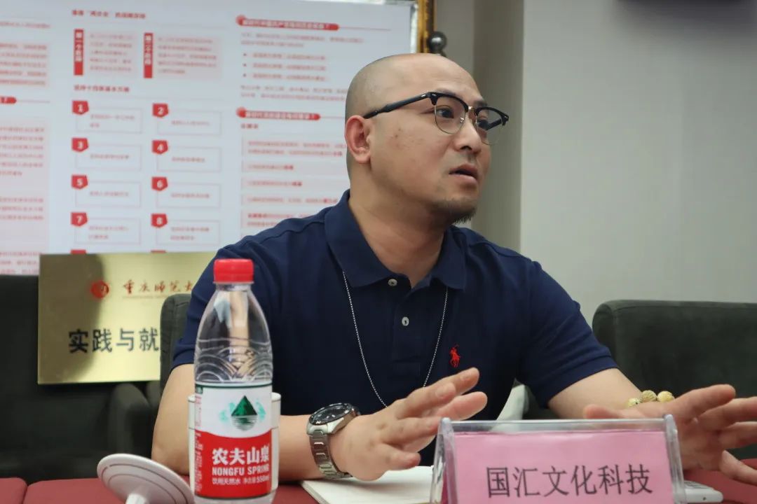 国汇文化科技有限公司常务副总刘俊良简单介绍了公司情况,他指出企业需要优质的人才推动行业的发展,并肯定了基于项目的人才培养模式,提出双方应继续深入探讨合作方式。