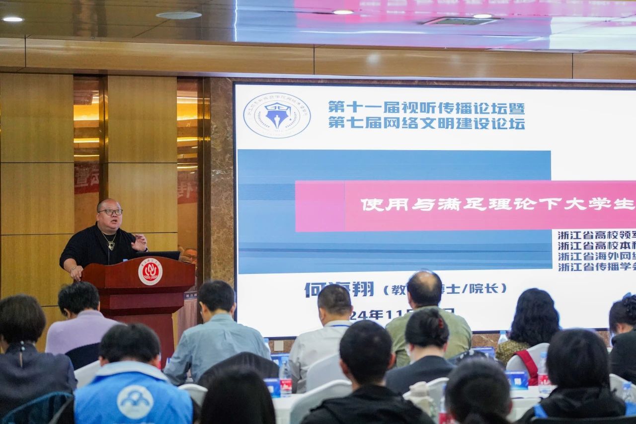 浙江越秀外国语学院网络传播学院院长、教授,全球修辞学会-视听传播学会常务副会长何海翔作《使用与满足理论下大学生 B 站弹幕文化研究》主题报告。