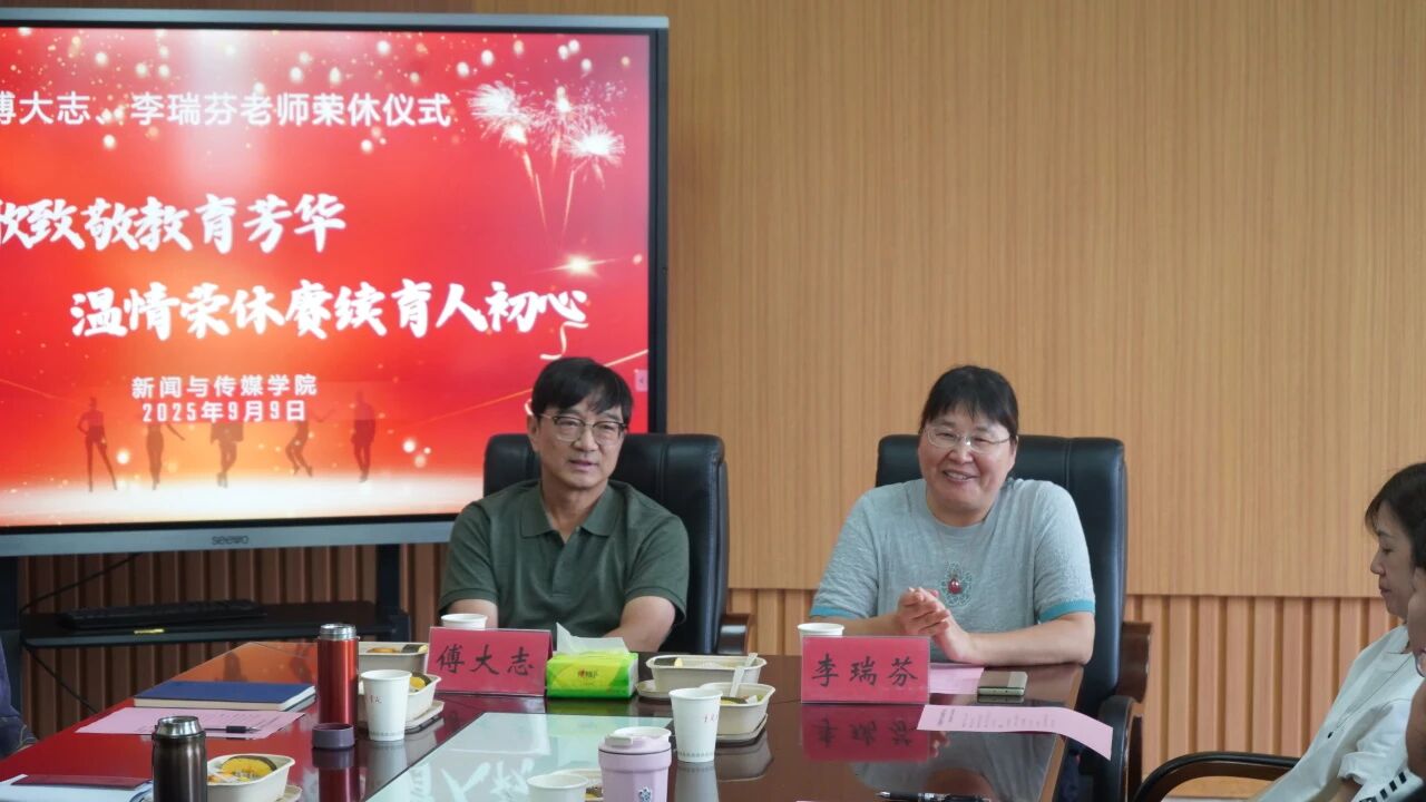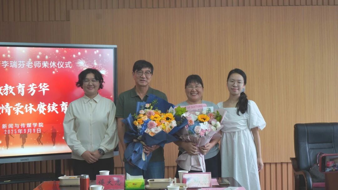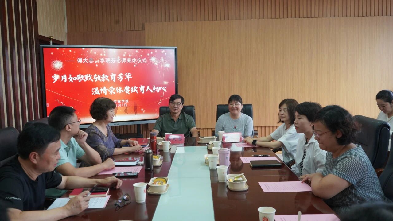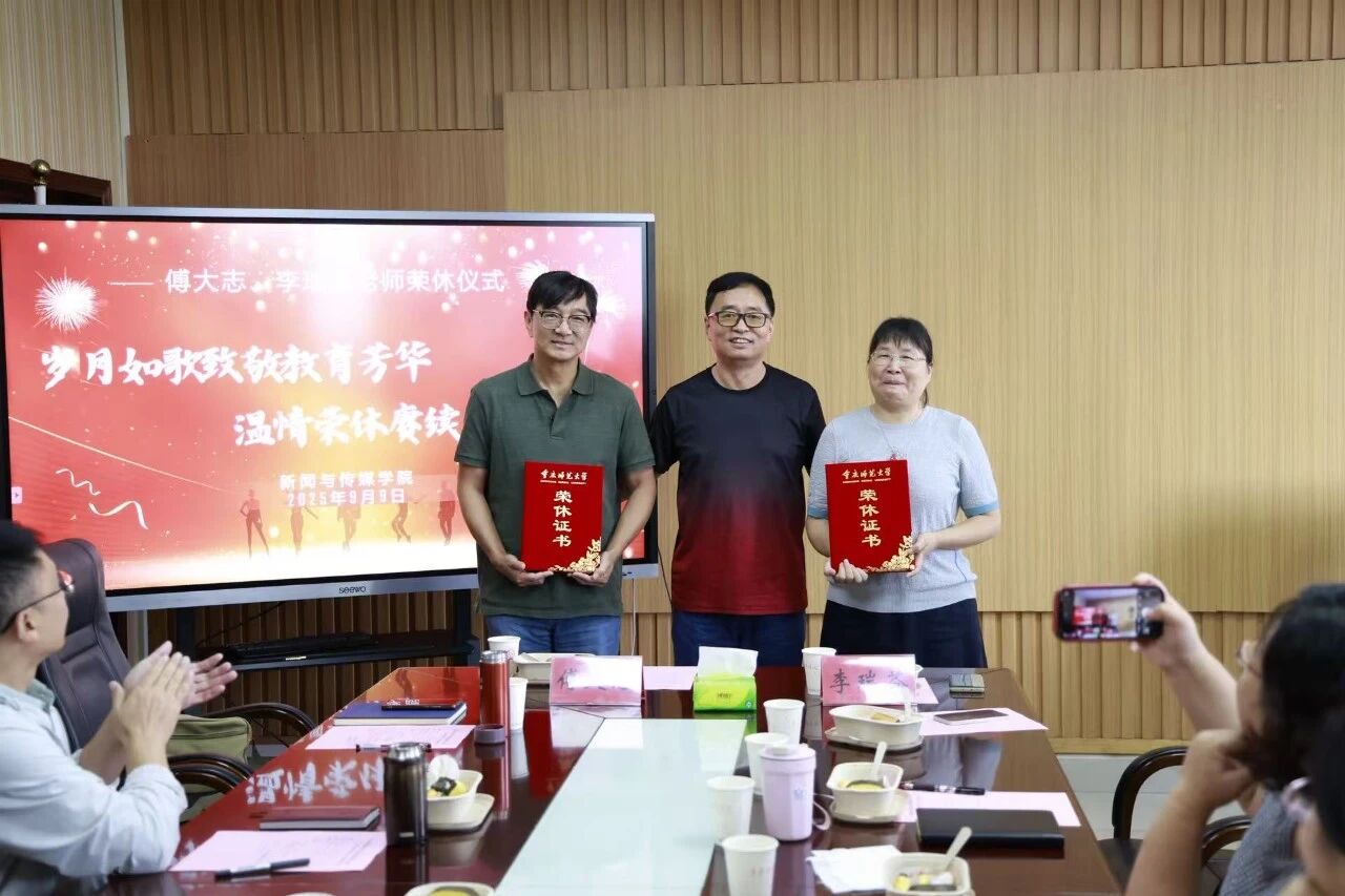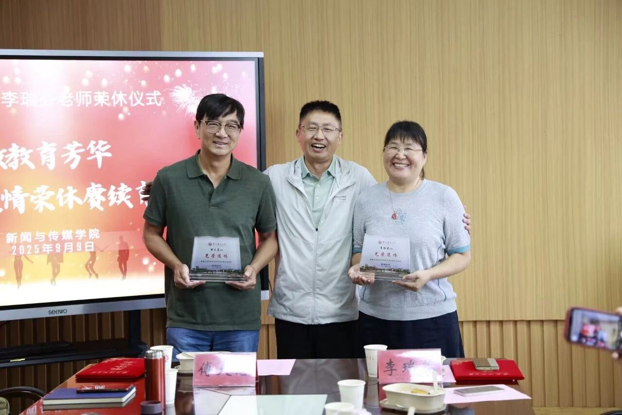 会议末,陈谦书记为两位老师颁发荣休证书,李明海院长送上刻有他们姓名的荣休纪念摆件。全场师生起身鼓掌,热烈的掌声在会议室里久久回荡,这掌声里有不舍、有感恩,更有对两位老师退休生活的美好祝愿。“常回家看看!”一句简单的期盼,成为全场共同的心声。荣休不是终点,而是另一段美好人生的开始。愿两位老师回首教育生涯不留遗憾,愿他们的精神鼓舞更多老师和同学们积极投入新闻事业。