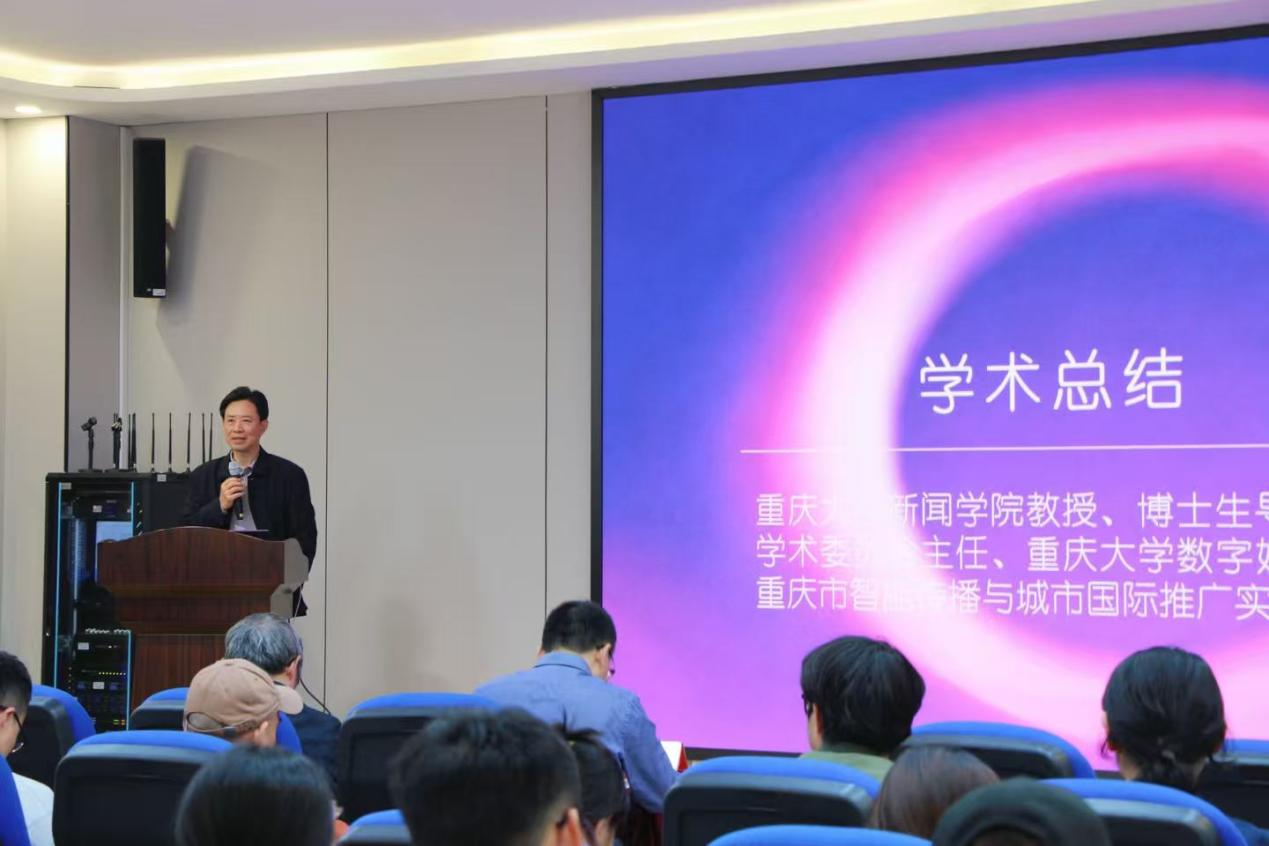 三位教授报告完毕,重庆大学新闻学院教授、博士生导师,重庆新闻学院特聘教授董天策总结说,三位专家分别呈现了智能传播研究的“三维坐标”——吴晔教授梳理学科脉络,汤景泰教授聚焦国际传播实践,匡文波教授展开批判性反思。三位教授同心协力,为师生提供了研究智能传播进展的多元视角。他强调,智能传播时代传播研究的核心是“跨学科融合”。不论是吴烨教授的物理学背景,还是汤景泰教授从文学到计算传播学的转型,均证明文科生与理工科生皆可在该领域立足。他鼓励同学们拓宽视野,主动参与多学科学术活动,在学科交叉中寻找灵感,培养“既能做数据分析,又能写深度评论”的复合型能力,为智能传播研究与实践贡献力量。